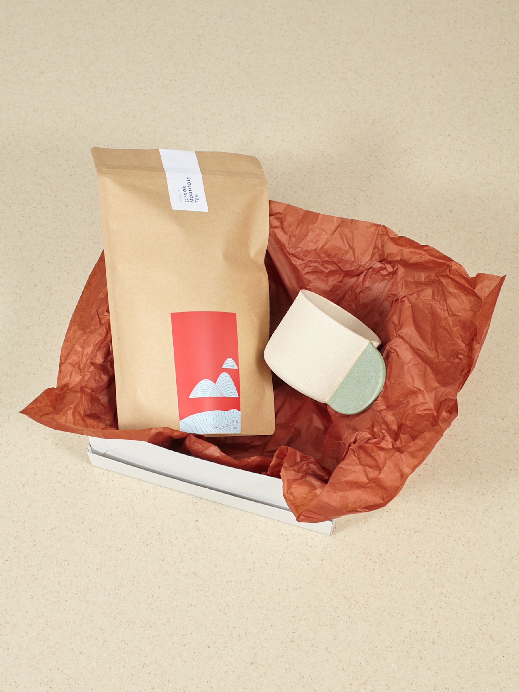 The Brutes Rami Tea set includes a large mug by Brutes, a ceramic brand from London and a package of a herbal tea "Greek Mountain Tea" by Rami Tea, a teahouse based in Vienna, Austria.