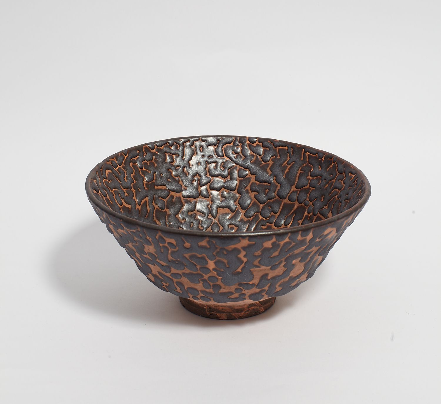 The black glaze made of iron and ash has its origin from Japan, but was modified by Matthias Kaiser. All the pieces with the iron/ash glaze were burned very hot in the ceramic furnace, which melts the metal and the ash together. This approach creates an interesting structure. Kaiser uses clay that has its origin in the Czech Republic and is completely natural.