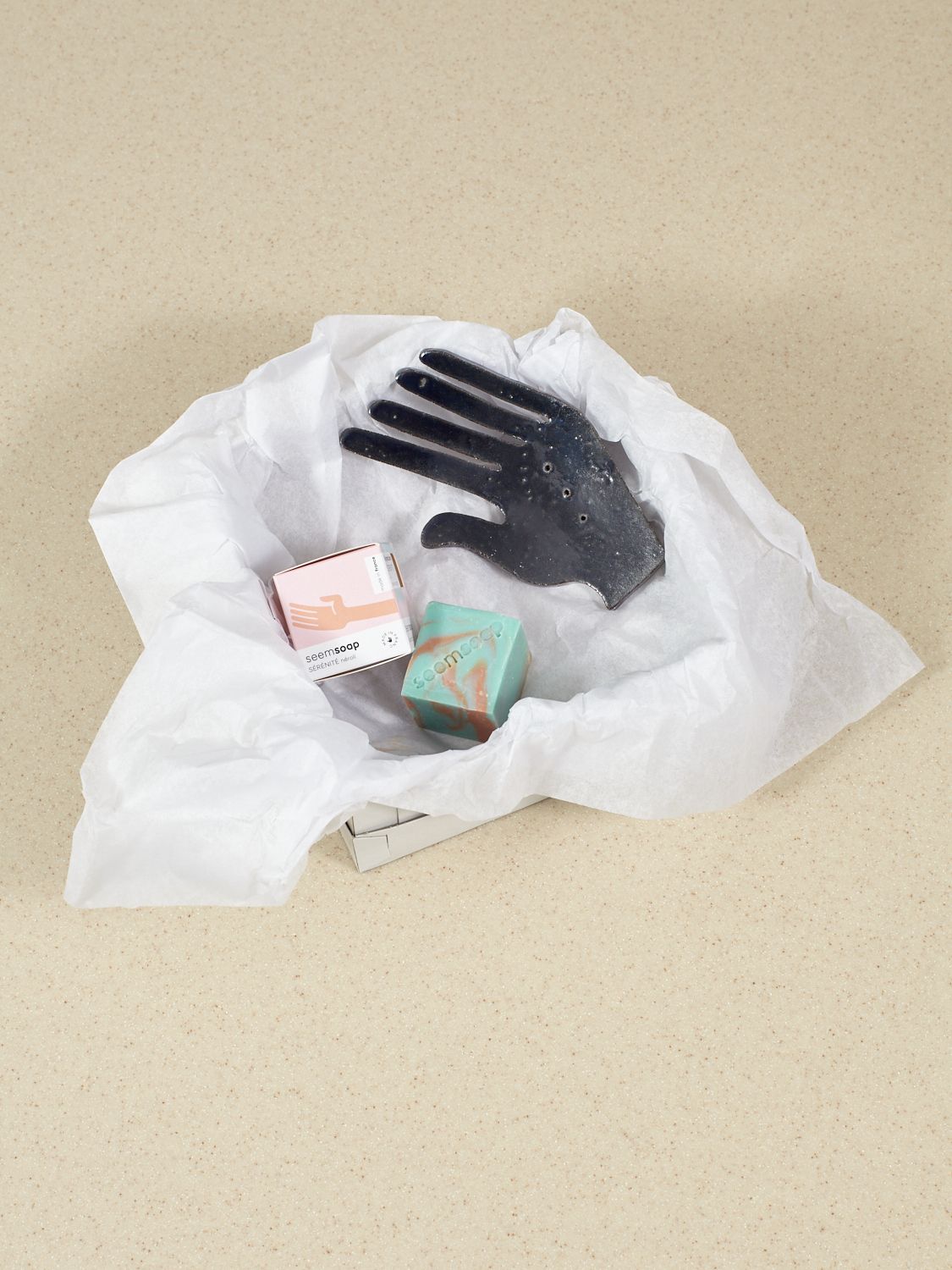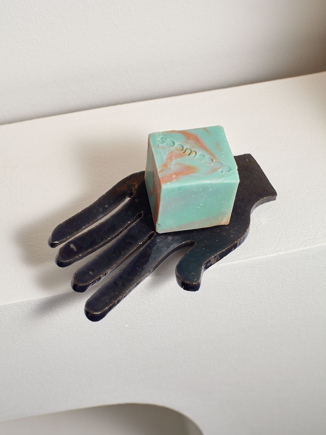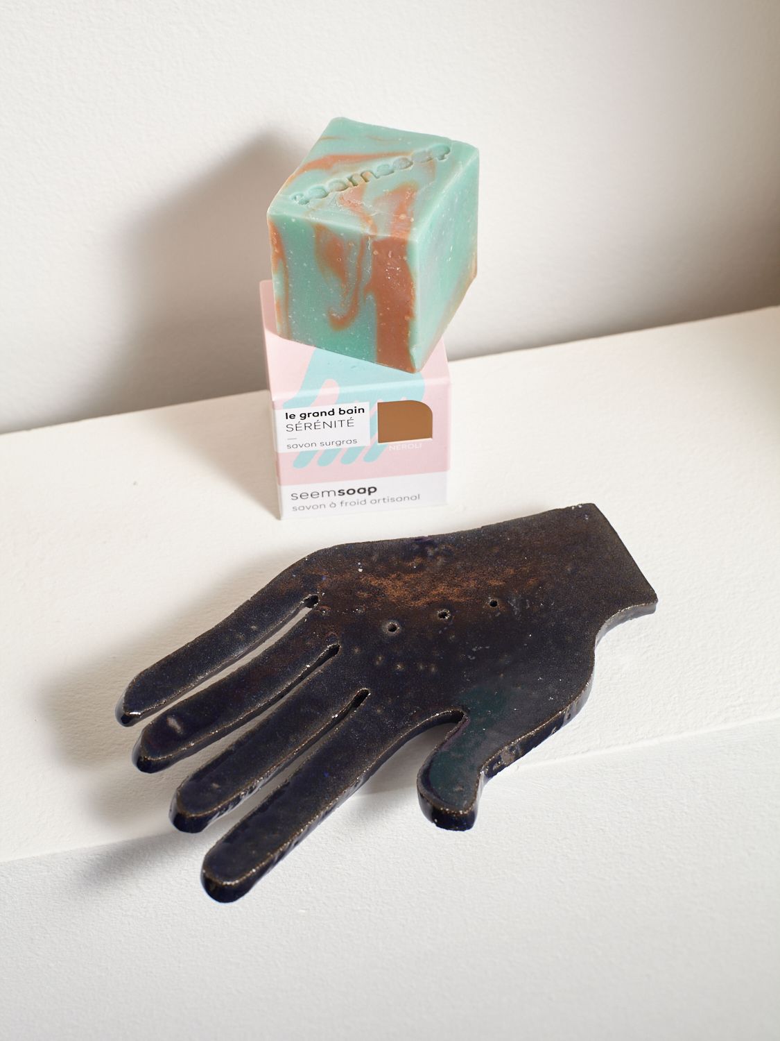 The ceramic hand soap dish was created by Seem Soap in collaboration with ceramist Marie Fekroun, who works the clay with emotion to create a reconnection to nature and human being.