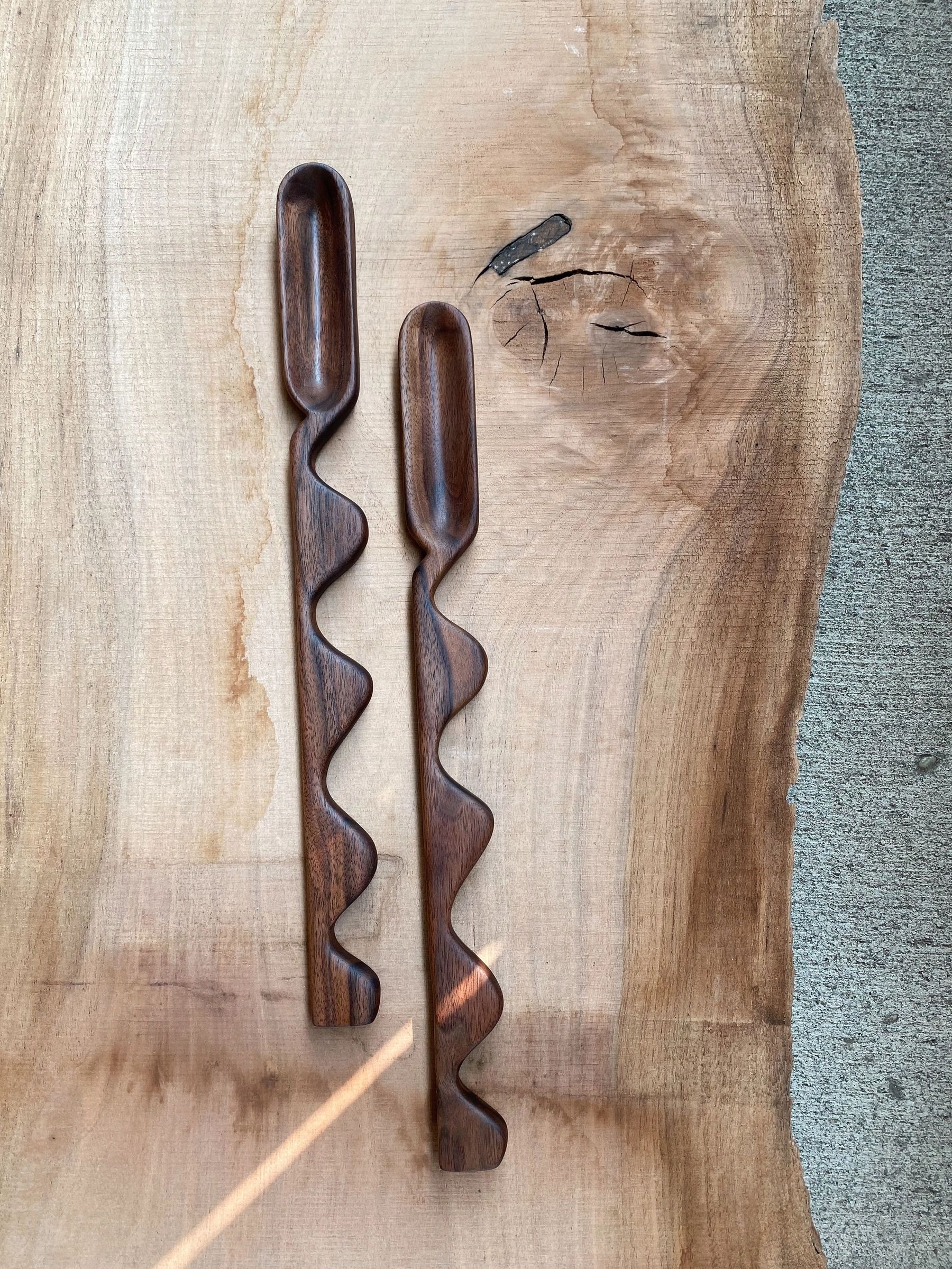 The sculptural Squiggle spoon is hand-carved and perfect for all cooking needs with a deep bowl and a thick squiggle-shaped handle. The bowl of the spoon is a textured finish that is hand-sanded so that it’s soft to the touch. $3 from each item sold will be donated to the National Forest Foundation. One dollar will plant one native tree.